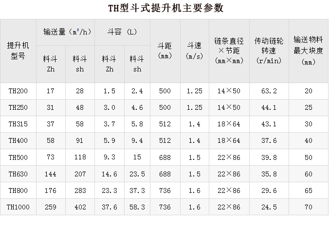 TH斗式提升機(jī)按料斗分為:ZH型(中深斗)一般使用于輸送濕的、結(jié)塊、較難拋出的物料, 如濕砂、型砂、化肥、堿粉等;SH型(深斗)一般使用于輸送干燥的、松散易于拋出的物料,如水泥、碎石、煤塊等。